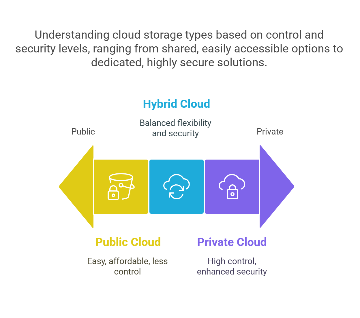 This storage is dedicated to one organization. It can be hosted either by the company or by a third-party provider. Private cloud storage offers better control and security, making it a good choice for businesses with high security needs. -