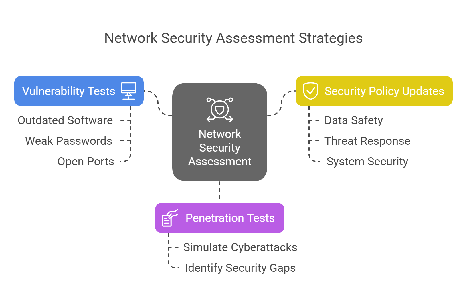 Scan your network regularly to find weaknesses. Look for outdated software, weak passwords, or open ports that hackers could use to get in.
